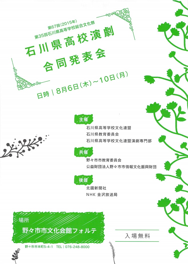 | 13:30-14:30 | 15 | 石川県立金沢伏見 | 逃ゲ道ナシ | 和田 和真 作 | |